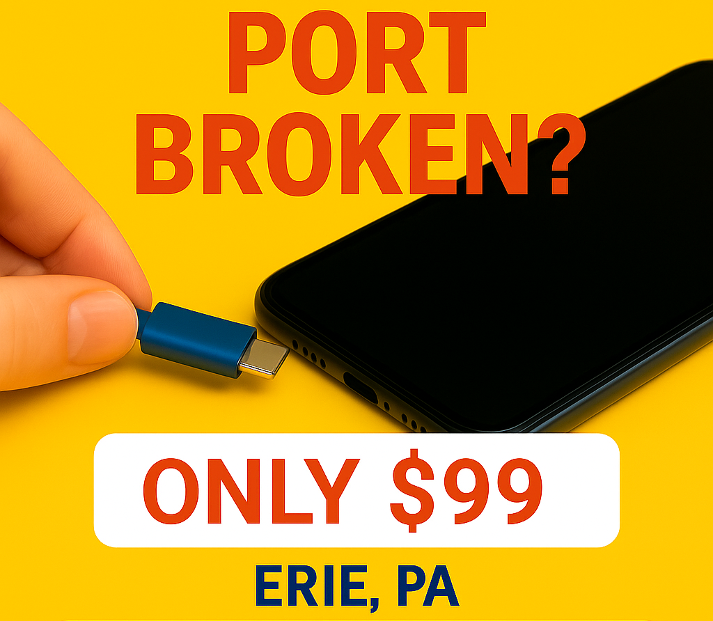 📱 Phone or Tablet not charging? Get your charging port fixed professionaly! Promotional Price just $99 in Erie, PA. BOOK YOUR REPAIR NOW!